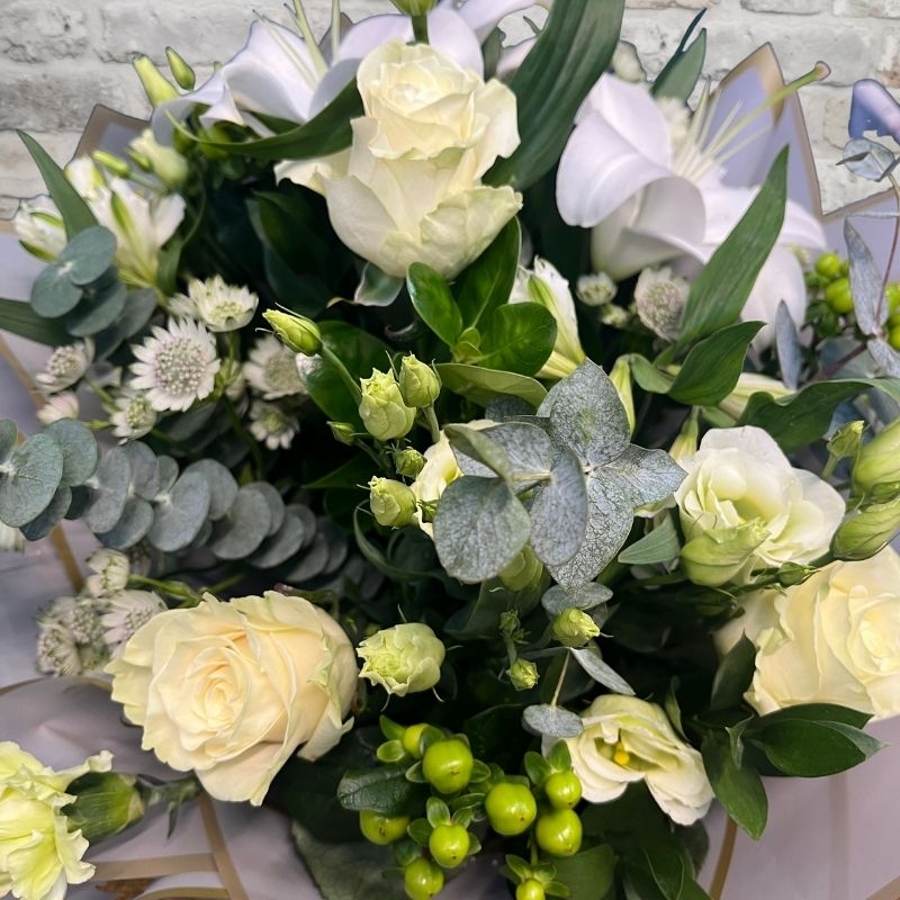 In white and green tones, designed by our florists in West Malling. Perfect for those who prefer a softer, more understated Valentine’s gift.